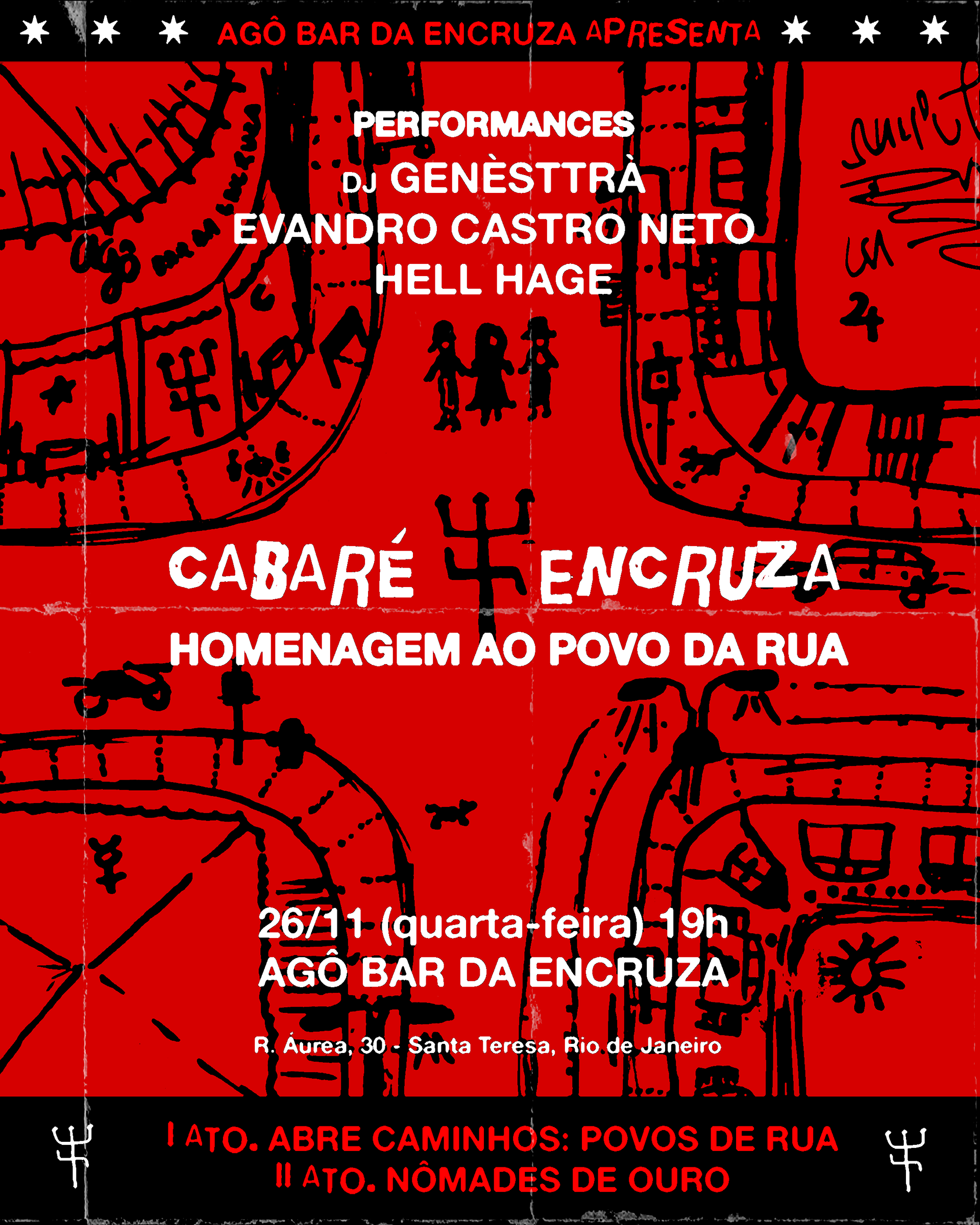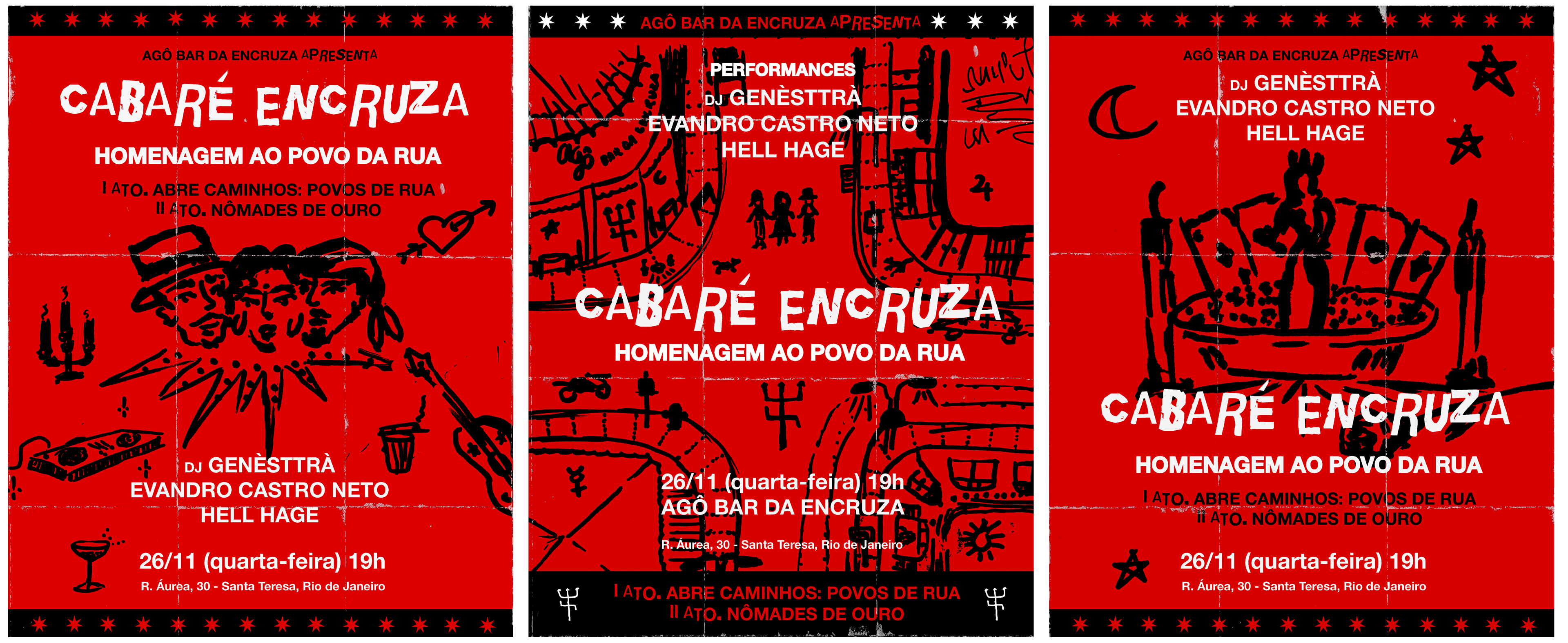 Desta vez, desenvolvi os encartes da performance Cabaré Encruza, que acontece no Agô – Bar da Encruza, em Santa Teresa, Rio de Janeiro. Busquei reproduzir a rua/encruzilhada onde o bar está localizado, criar caricaturas dos artistas que se apresentarão e incorporar elementos que dialogam com a estética do espaço e com a temática das performances.