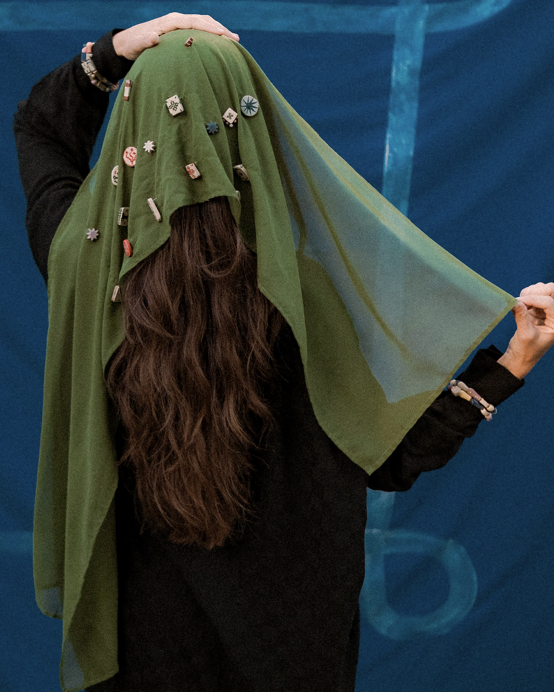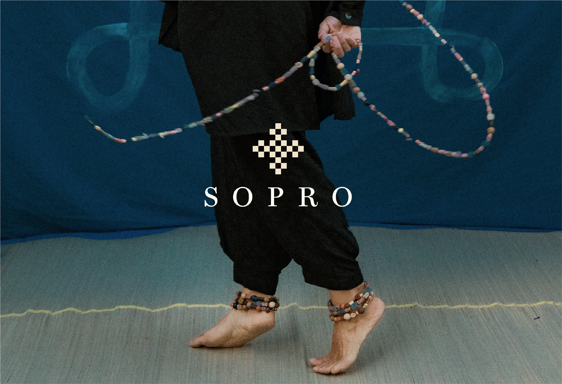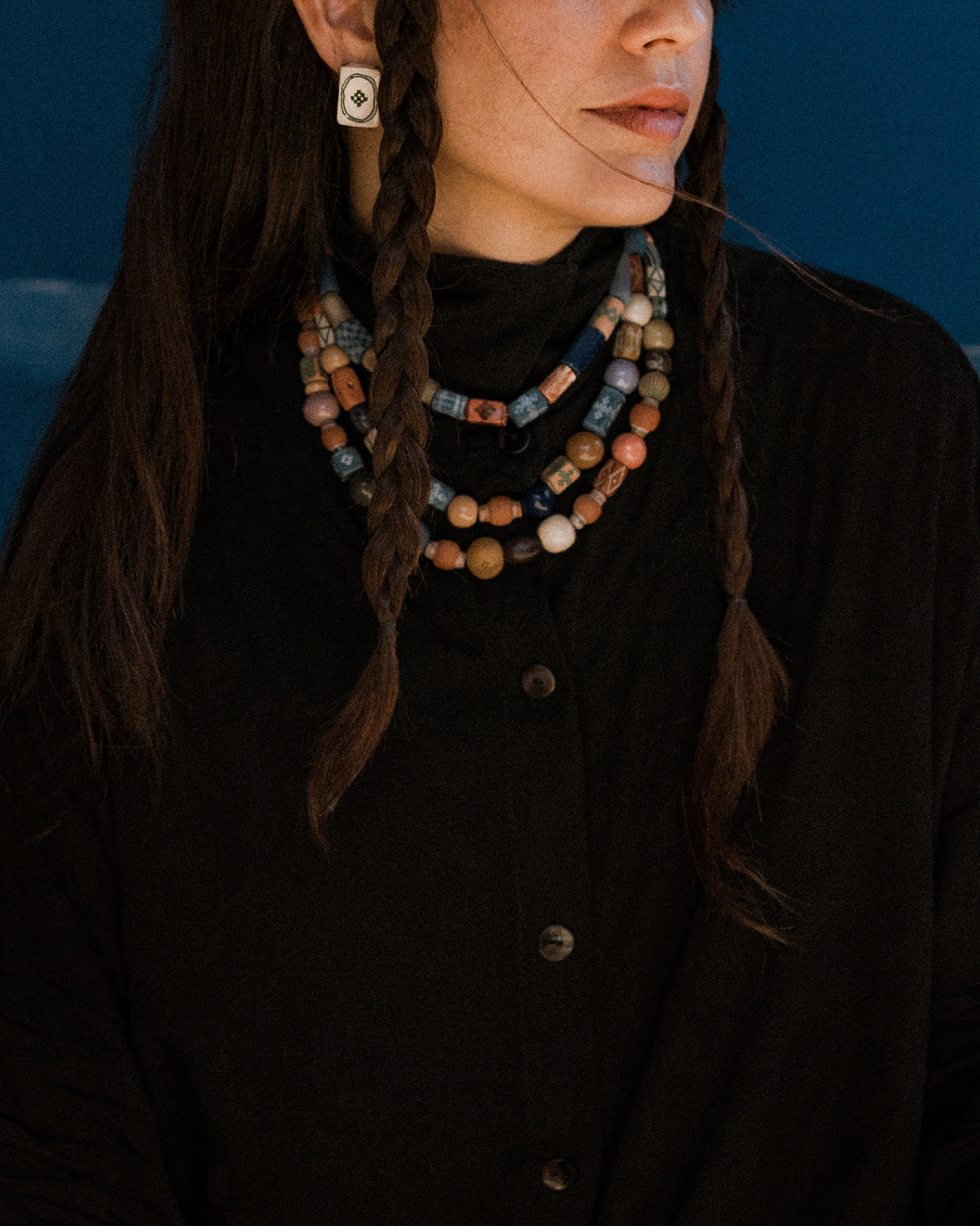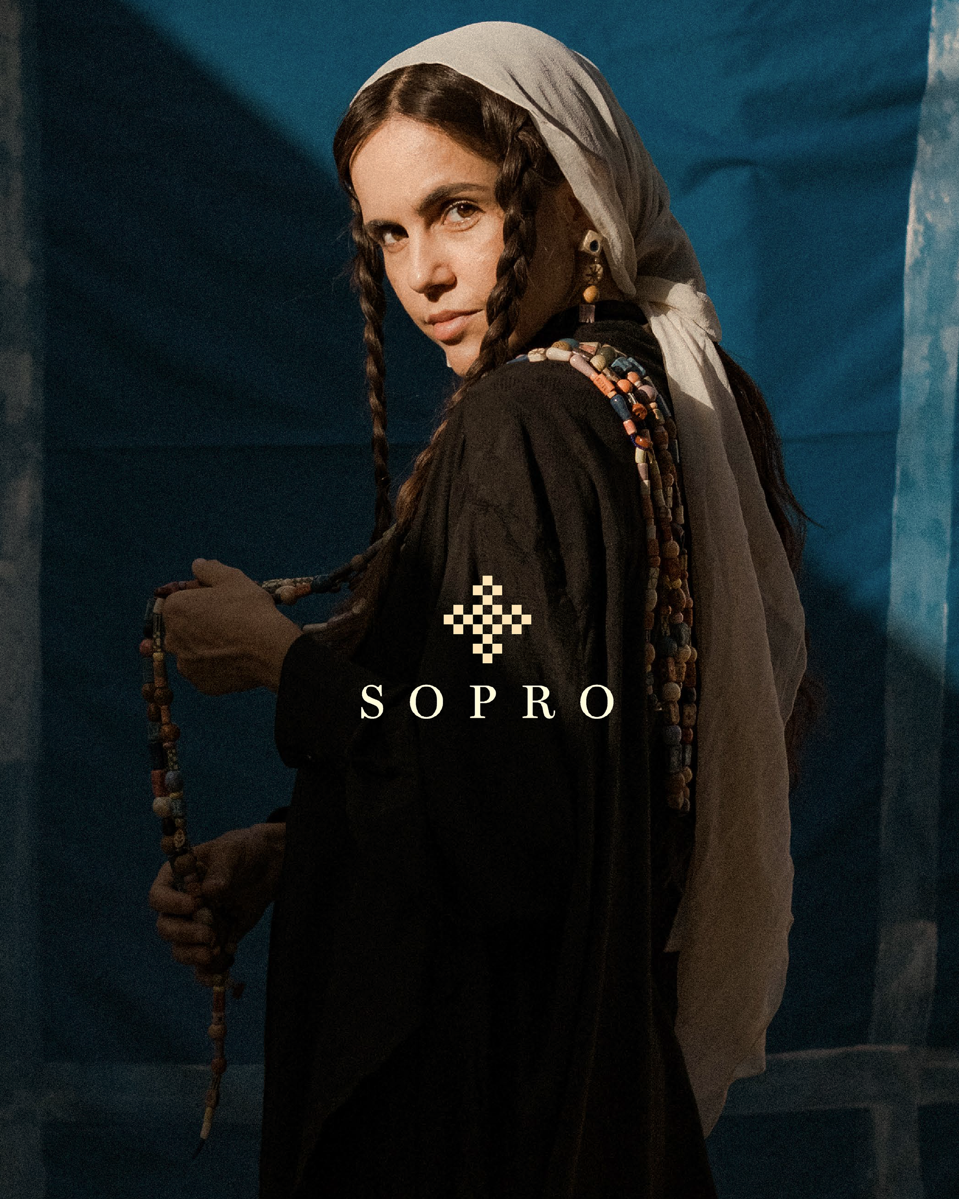 A moldura visual foi criada a partir de um dos desenhos presentes nas próprias contas, transformando o gesto artesanal em elemento gráfico identitário. Já o azul foi escolhido como cor predominante por carregar a dualidade entre realeza e calmaria — imponência e serenidade coexistindo em equilíbrio.